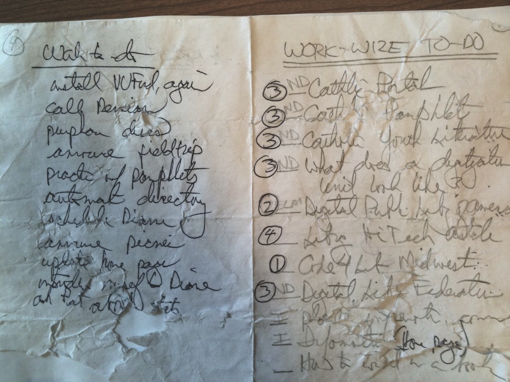 This morning, after the list was was a dry as it was going to be, I photographed both sides of it, did my best color-correct the image, converted the whole thing into a PDF file, and printed the result. While the it looks like heck, the time I spent salvaging my intellectual efforts were much shorter than the time I would have spent recreating the list. Like a blues, such recreations are never exactly the same as the originals. But it would have been a whole lot better if I hadn’t gone swimming with my to-do list in the first place.