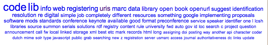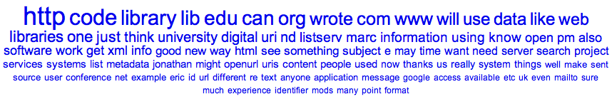 A couple of years ago the Code4Lib community created an RSS “planet” called Planet Code4Lib — “Blogs and feeds of interest to the Code4Lib community, aggregated.” I think it is maintained by Jonathan Rochkind, but I’m not sure. It is pretty nice since it brings together the RSS feeds from quite a number of library “hackers”. Similarly, there is another planet called Planet Cataloging which does the same thing for library cataloging feeds. This one is maintained by Jennifer W. Baxmeyer and Kevin S. Clarke. The combined planets work very well together, except when individual blogs are in both aggregations. When this happens I end up reading the same blog postings twice. Not a big deal. You get what you pay for.